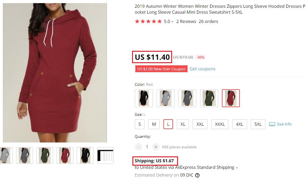 As you can see, on the right are two different dress prices. But if we go to the ad, we will see that different colors and sizes are available. After clicking on the color and size, we will see the final price of the product. For example, in the following image, we have chosen a dress in red and size L, the final price will be $ 11.40 plus postage, which has not yet been included but is listed below.