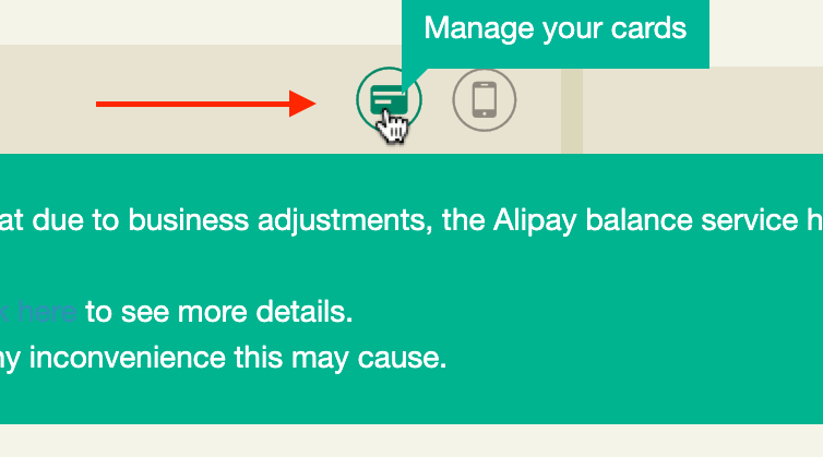 3. In your AliPay account, click on "Manage your cards" at the top right.